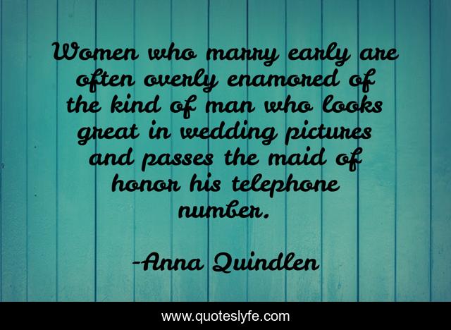 This page presents the quote "Women who marry early are often overly enamored of the kind of man who looks great in wedding pictures and passes the maid of honor his telephone number.". Author of this quote is Anna Quindlen. This quote is about great, wedding, man,.