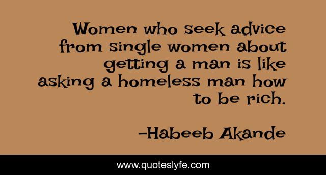 This page presents the quote "Women who seek advice from single women about getting a man is like asking a homeless man how to be rich.". Author of this quote is Habeeb Akande. This quote is about relationships, funny, humour, advice, marriage, male-female-relationships, single-women, comedy, women,.