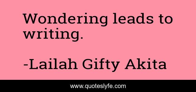 This page presents the quote "Wondering leads to writing.". Author of this quote is Lailah Gifty Akita. This quote is about daily-inspiration, lifelong-learner, writing, wisdom-of-lailah-gifty-akita, wondering, self-discovery, life-philosophy,.