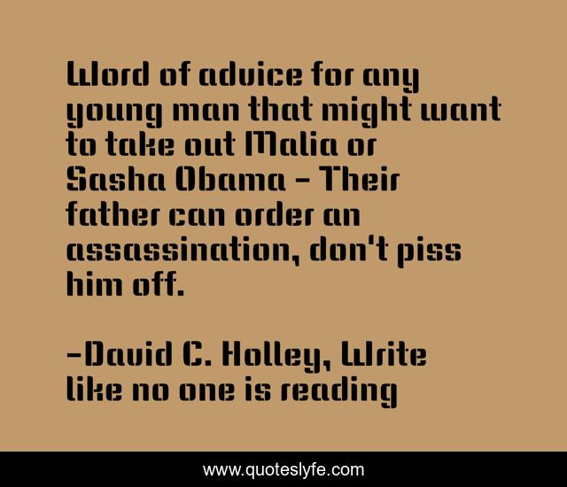 This page presents the quote "Word of advice for any young man that might want to take out Malia or Sasha Obama - Their father can order an assassination, don't piss him off.". Author of this quote is David C. Holley, Write like no one is reading. This quote is about piss-off, humor, awkward, advice, assassination, absurd, obama,.