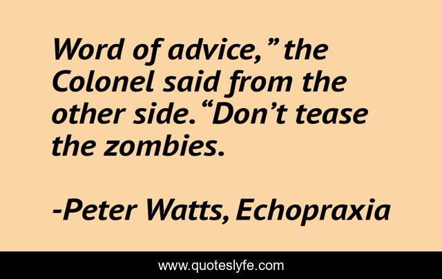This page presents the quote "Word of advice, ” the Colonel said from the other side. “Don’t tease the zombies.". Author of this quote is Peter Watts, Echopraxia. This quote is about zombies, tease,.