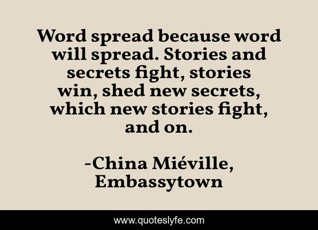 This page presents the quote "Word spread because word will spread. Stories and secrets fight, stories win, shed new secrets, which new stories fight, and on.". Author of this quote is China Miéville, Embassytown. This quote is about secrets, gossip, stories,.