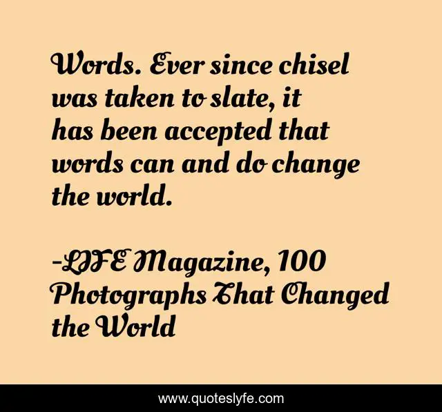This page presents the quote "Words. Ever since chisel was taken to slate, it has been accepted that words can and do change the world.". Author of this quote is LIFE Magazine, 100 Photographs That Changed the World. This quote is about change-the-world, life, power-of-words,.