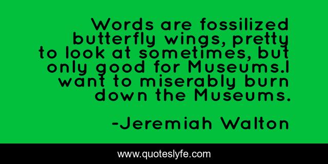 This page presents the quote "Words are fossilized butterfly wings, pretty to look at sometimes, but only good for Museums.I want to miserably burn down the Museums.". Author of this quote is Jeremiah Walton. This quote is about poem, poets, love, activism, poetry, activist, words, action, affection,.