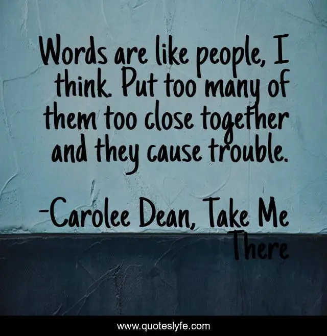 This page presents the quote "Words are like people, I think. Put too many of them too close together and they cause trouble.". Author of this quote is Carolee Dean, Take Me There. This quote is about dylan-dawson, thought-provoking, words, people,.