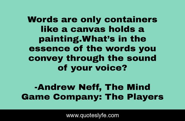 This page presents the quote "Words are only containers like a canvas holds a painting.What’s in the essence of the words you convey through the sound of your voice?". Author of this quote is Andrew Neff, The Mind Game Company: The Players. This quote is about personal-connections, communication, mind-games, introspective, words, illumination,.