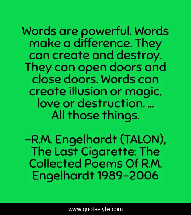 This page presents the quote "Words are powerful. Words make a difference. They can create and destroy. They can open doors and close doors. Words can create illusion or magic, love or destruction. … All those things.". Author of this quote is R.M. Engelhardt (TALON), The Last Cigarette: The Collected Poems Of R.M. Engelhardt 1989-2006. This quote is about poetry, quotes, slam, r-m-engelhardt, poet, times-union, on-writing, inspiration,.