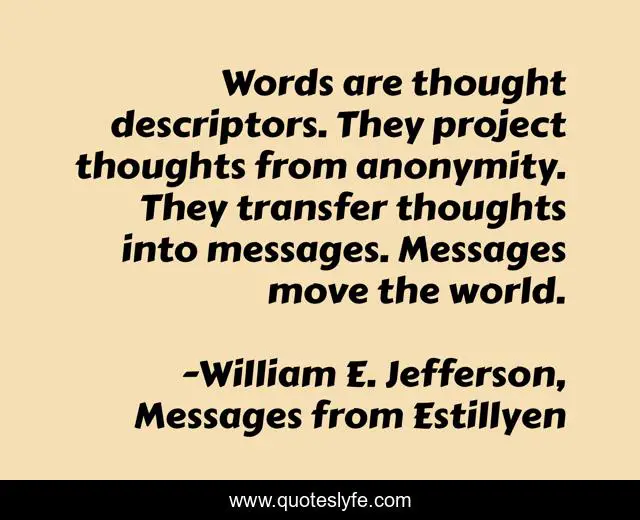 "William E. Jefferson, Messages from Estillyen Quotes." Quoteslyfe.com, 2025. Sat. 06 Dec. 2025. <https://www.quoteslyfe.com/quote/Words-are-thought-descriptors-They-project-thoughts-113284>.