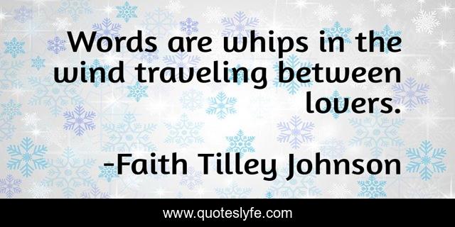 This page presents the quote "Words are whips in the wind traveling between lovers.". Author of this quote is Faith Tilley Johnson. This quote is about travel, lovers, whisps, words,.