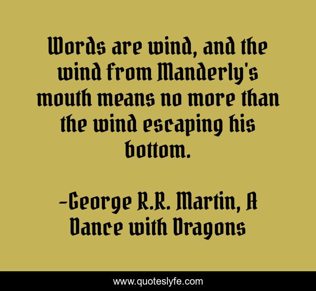 This page presents the quote "Words are wind, and the wind from Manderly's mouth means no more than the wind escaping his bottom.". Author of this quote is George R.R. Martin, A Dance with Dragons. This quote is about wind, words,.