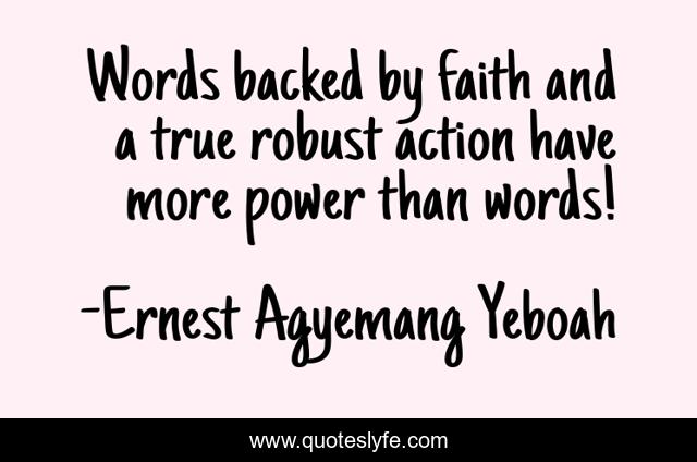 This page presents the quote "Words backed by faith and a true robust action have more power than words!". Author of this quote is Ernest Agyemang Yeboah. This quote is about action, faith, words, the-power-of-words,.