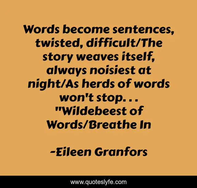 This page presents the quote "Words become sentences, twisted, difficult/The story weaves itself, always noisiest at night/As herds of words won't stop. . . "Wildebeest of Words/Breathe In". Author of this quote is Eileen Granfors. This quote is about process, insomnia, moving-on, writing,.