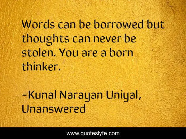 This page presents the quote "Words can be borrowed but thoughts can never be stolen. You are a born thinker.". Author of this quote is Kunal Narayan Uniyal, Unanswered. .