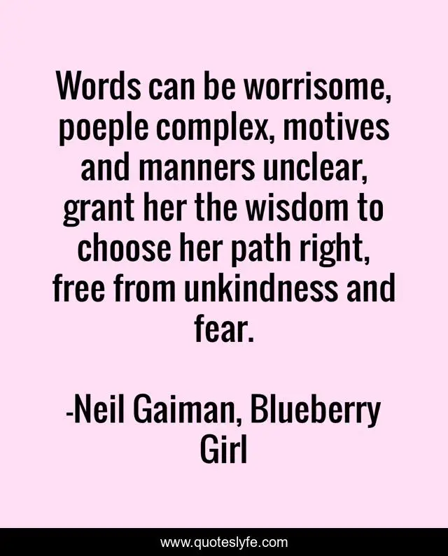 This page presents the quote "Words can be worrisome, poeple complex, motives and manners unclear, grant her the wisdom to choose her path right, free from unkindness and fear.". Author of this quote is Neil Gaiman, Blueberry Girl. This quote is about life, girls, childrens,.