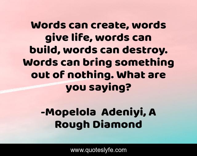 This page presents the quote "Words can create, words give life, words can build, words can destroy. Words can bring something out of nothing. What are you saying?". Author of this quote is Mopelola Adeniyi, A Rough Diamond. This quote is about faith, confidence, positive, motivational, optimistic, life-lessons, life-and-living, inspiration,.