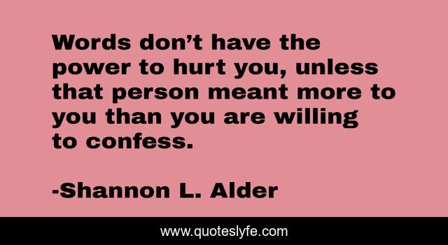 This page presents the quote "Words don’t have the power to hurt you, unless that person meant more to you than you are willing to confess.". Author of this quote is Shannon L. Alder. This quote is about love, honesty, family, quotes, spouses, revelation, reality, insecure-men, men,.