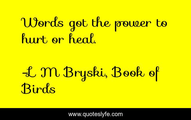 This page presents the quote "Words got the power to hurt or heal.". Author of this quote is L M Bryski, Book of Birds. This quote is about book-of-birds, hurting, power, life, meaning, lm-bryski, healing, words,.