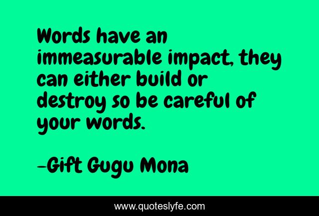This page presents the quote "Words have an immeasurable impact, they can either build or destroy so be careful of your words.". Author of this quote is Gift Gugu Mona. This quote is about destroy, careful, immeasurable-impact, build, words,.