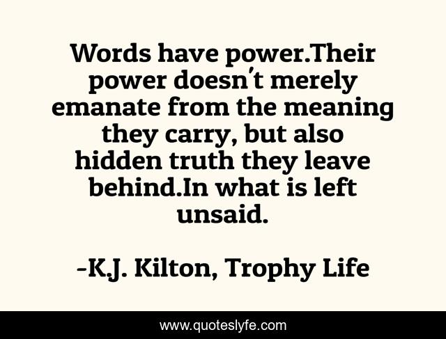 This page presents the quote "Words have power.Their power doesn't merely emanate from the meaning they carry, but also hidden truth they leave behind.In what is left unsaid.". Author of this quote is K.J. Kilton, Trophy Life. This quote is about truth, merely, power-of-words, words,.