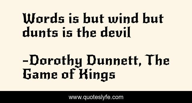 This page presents the quote "Words is but wind but dunts is the devil". Author of this quote is Dorothy Dunnett, The Game of Kings. This quote is about words, dunts,.