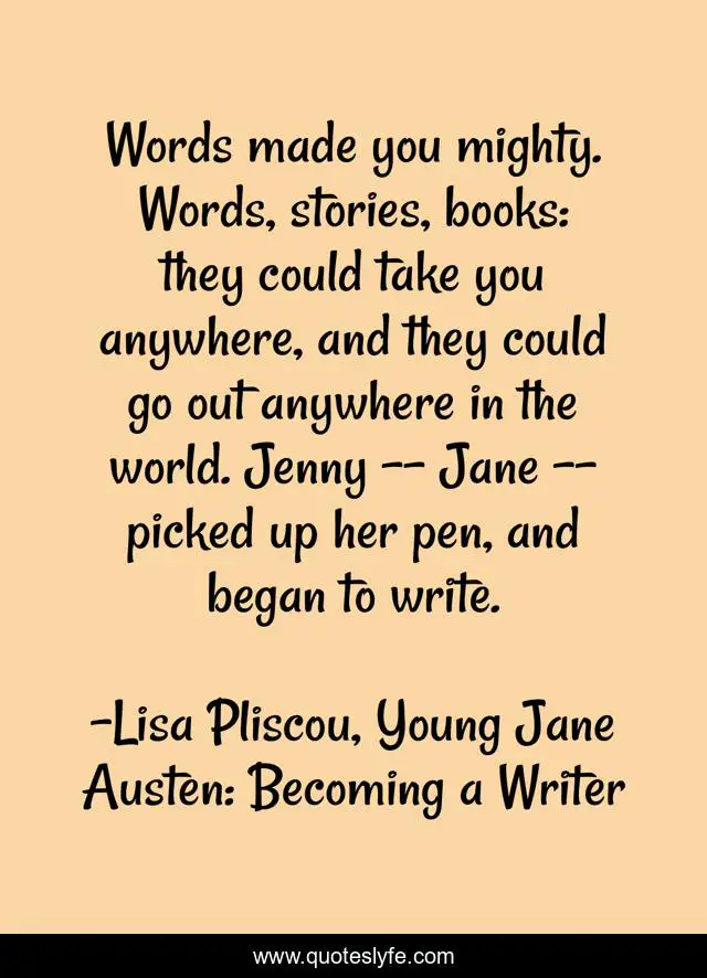 This page presents the quote "Words made you mighty. Words, stories, books: they could take you anywhere, and they could go out anywhere in the world. Jenny -- Jane -- picked up her pen, and began to write.". Author of this quote is Lisa Pliscou, Young Jane Austen: Becoming a Writer. This quote is about writers, jane-austen, writing-life, young-jane-austen,.