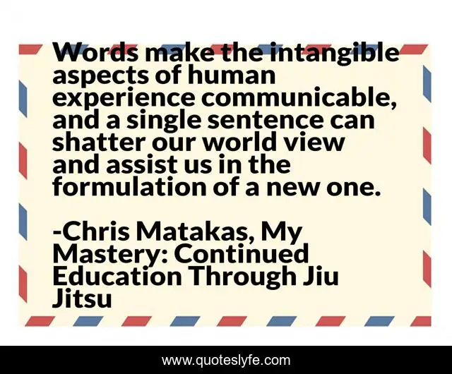 This page presents the quote "Words make the intangible aspects of human experience communicable, and a single sentence can shatter our world view and assist us in the formulation of a new one.". Author of this quote is Chris Matakas, My Mastery: Continued Education Through Jiu Jitsu. This quote is about communication, perception, thoughts, words, quotes,.