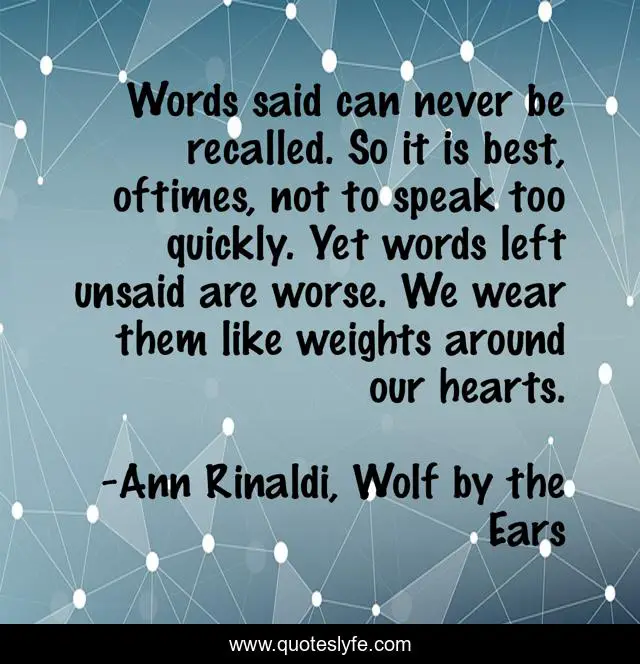 This page presents the quote "Words said can never be recalled. So it is best, oftimes, not to speak too quickly. Yet words left unsaid are worse. We wear them like weights around our hearts.". Author of this quote is Ann Rinaldi, Wolf by the Ears. This quote is about ann-rinaldi, wolf-by-the-ears, unsaid-words, words, speak,.