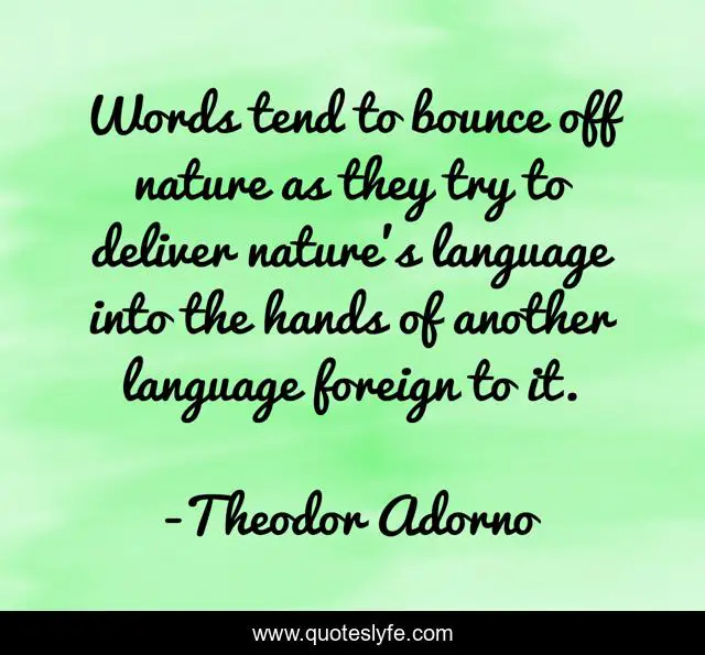 This page presents the quote "Words tend to bounce off nature as they try to deliver nature's language into the hands of another language foreign to it.". Author of this quote is Theodor Adorno. This quote is about lanaguagege, nature, words, outdoors,.
