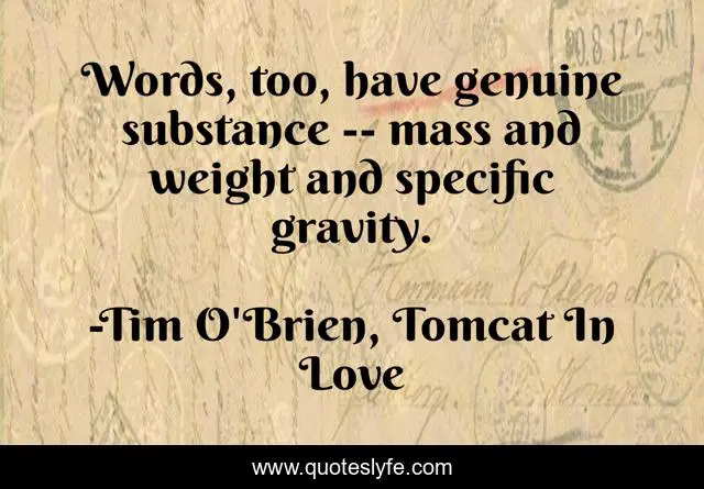 This page presents the quote "Words, too, have genuine substance -- mass and weight and specific gravity.". Author of this quote is Tim O'Brien, Tomcat In Love. This quote is about science, language, words,.