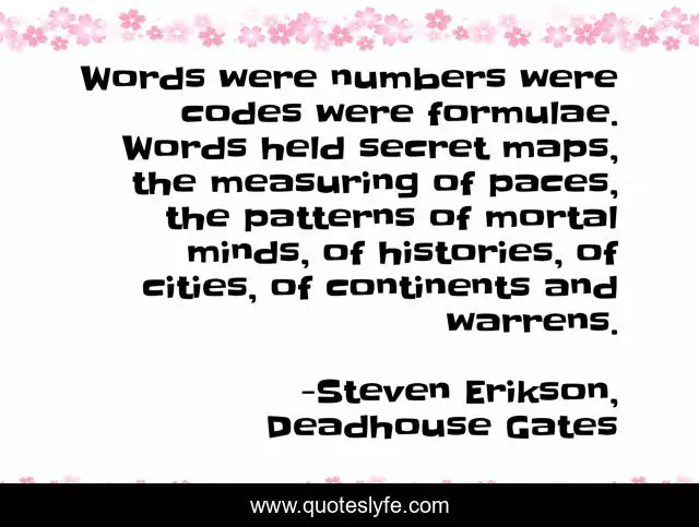 This page presents the quote "Words were numbers were codes were formulae. Words held secret maps, the measuring of paces, the patterns of mortal minds, of histories, of cities, of continents and warrens.". Author of this quote is Steven Erikson, Deadhouse Gates. This quote is about mortals, words, warren,.