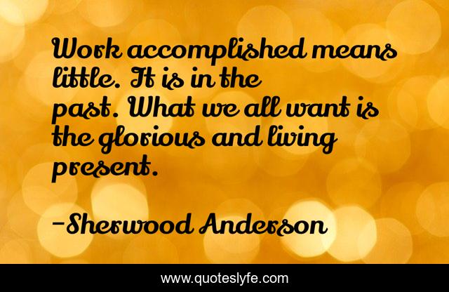 This page presents the quote "Work accomplished means little. It is in the past. What we all want is the glorious and living present.". Author of this quote is Sherwood Anderson. .