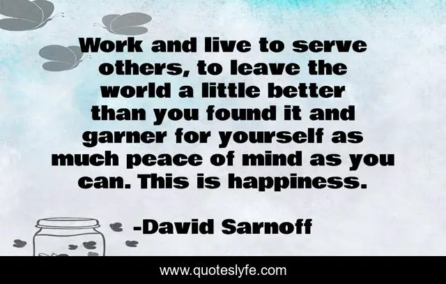 This page presents the quote "Work and live to serve others, to leave the world a little better than you found it and garner for yourself as much peace of mind as you can. This is happiness.". Author of this quote is David Sarnoff. This quote is about world, work, peace,.