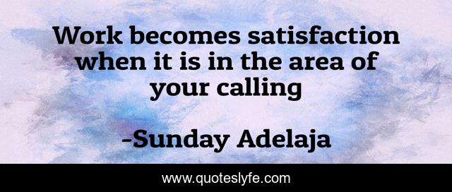 This page presents the quote "Work becomes satisfaction when it is in the area of your calling". Author of this quote is Sunday Adelaja. This quote is about kingdom, life, love, destiny, service, people, money, god, work,.
