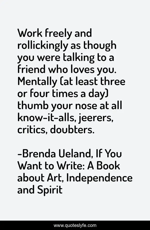 This page presents the quote "Work freely and rollickingly as though you were talking to a friend who loves you. Mentally (at least three or four times a day) thumb your nose at all know-it-alls, jeerers, critics, doubters.". Author of this quote is Brenda Ueland, If You Want to Write: A Book about Art, Independence and Spirit. This quote is about critics, freedom, friends, writing,.