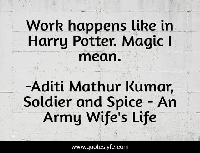 This page presents the quote "Work happens like in Harry Potter. Magic I mean.". Author of this quote is Aditi Mathur Kumar, Soldier and Spice - An Army Wife's Life. .