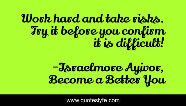 This page presents the quote "Work hard and take risks. Try it before you confirm it is difficult!". Author of this quote is Israelmore Ayivor, Become a Better You. This quote is about hard-worker, food-for-thought, confirmation, personal-development, hard-work, better-you, confirm, hard, success,.