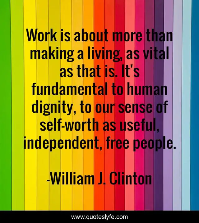 This page presents the quote "Work is about more than making a living, as vital as that is. It's fundamental to human dignity, to our sense of self-worth as useful, independent, free people.". Author of this quote is William J. Clinton. This quote is about independence, people,.