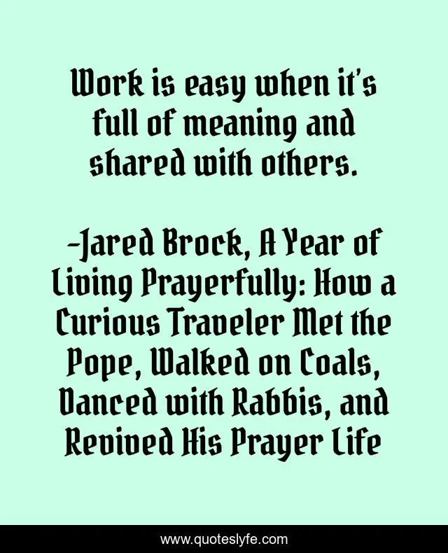 "Jared Brock, A Year of Living Prayerfully: How a Curious Traveler Met the Pope, Walked on Coals, Danced with Rabbis, and Revived His Prayer Life Quotes." Quoteslyfe.com, 2025. Fri. 05 Dec. 2025. <https://www.quoteslyfe.com/quote/Work-is-easy-when-it-s-full-142377>.