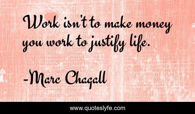 This page presents the quote "Work isn't to make money you work to justify life.". Author of this quote is Marc Chagall. This quote is about money, life,.