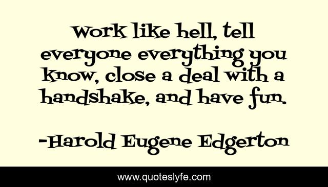 This page presents the quote "Work like hell, tell everyone everything you know, close a deal with a handshake, and have fun.". Author of this quote is Harold Eugene Edgerton. This quote is about life, work,.