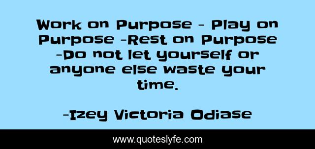 This page presents the quote "Work on Purpose - Play on Purpose -Rest on Purpose -Do not let yourself or anyone else waste your time.". Author of this quote is Izey Victoria Odiase. This quote is about time-management, waste-of-time, on-purpose, intention, time, intentional, intentional-living, time-is-priceless, wasting-time,.