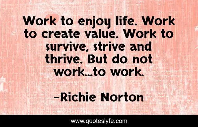This page presents the quote "Work to enjoy life. Work to create value. Work to survive, strive and thrive. But do not work...to work.". Author of this quote is Richie Norton. This quote is about enjoy, balance, work-life,.