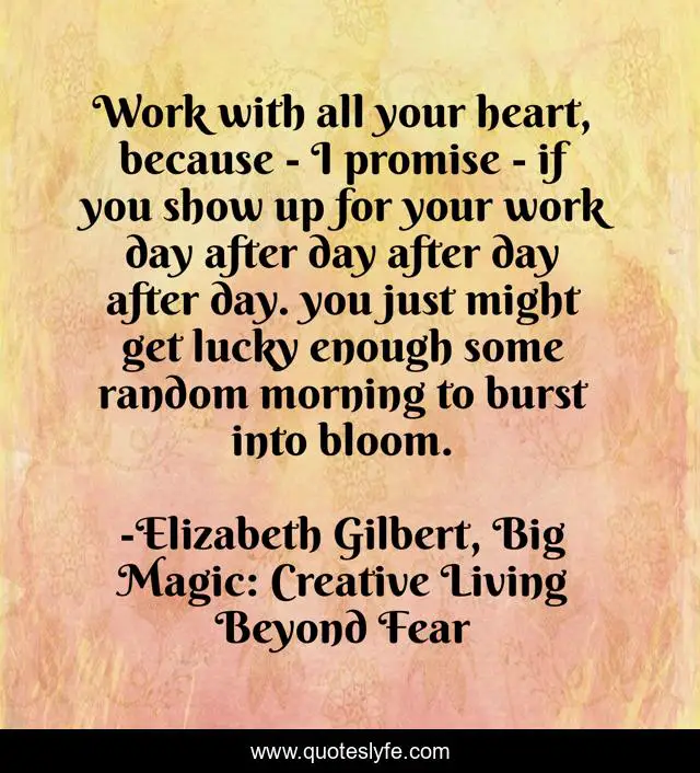 This page presents the quote "Work with all your heart, because - I promise - if you show up for your work day after day after day after day. you just might get lucky enough some random morning to burst into bloom.". Author of this quote is Elizabeth Gilbert, Big Magic: Creative Living Beyond Fear. This quote is about live, work, creativity, ideas, inspiration,.
