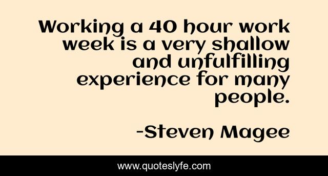 This page presents the quote "Working a 40 hour work week is a very shallow and unfulfilling experience for many people.". Author of this quote is Steven Magee. This quote is about week, shallow, working, hour, people, very, many, work, experience,.