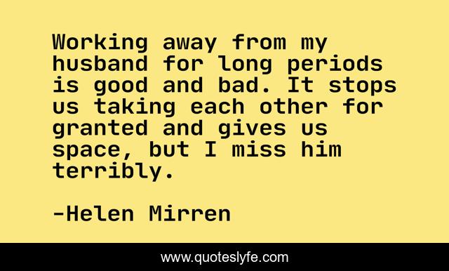 This page presents the quote "Working away from my husband for long periods is good and bad. It stops us taking each other for granted and gives us space, but I miss him terribly.". Author of this quote is Helen Mirren. This quote is about good, husband, long,.