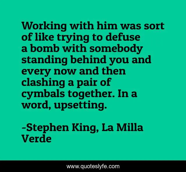 This page presents the quote "Working with him was sort of like trying to defuse a bomb with somebody standing behind you and every now and then clashing a pair of cymbals together. In a word, upsetting.". Author of this quote is Stephen King, La Milla Verde. This quote is about anger, temperment,.