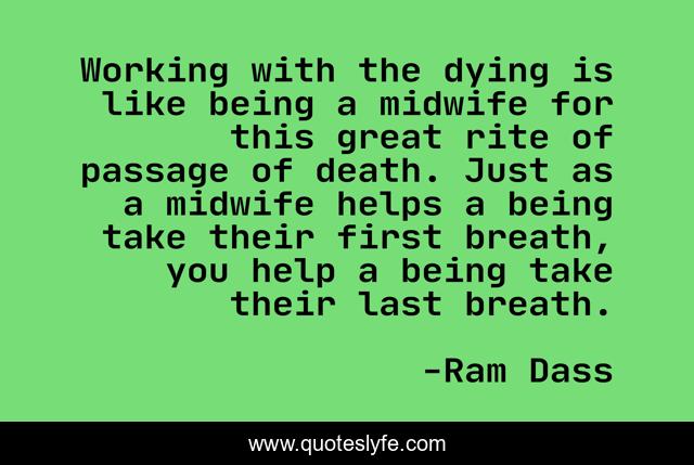 This page presents the quote "Working with the dying is like being a midwife for this great rite of passage of death. Just as a midwife helps a being take their first breath, you help a being take their last breath.". Author of this quote is Ram Dass. This quote is about great, help,.