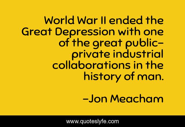 This page presents the quote "World War II ended the Great Depression with one of the great public-private industrial collaborations in the history of man.". Author of this quote is Jon Meacham. This quote is about great, depression, history,.