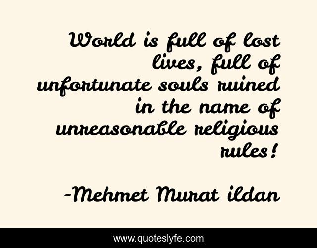This page presents the quote "World is full of lost lives, full of unfortunate souls ruined in the name of unreasonable religious rules!". Author of this quote is Mehmet Murat ildan. This quote is about turkish-writers, mehmet-murat-ildan, ildan-wise-sayings, turkish, ildan-wisdom, religious-rules, turkish-literature, turkish-playwrights, turkish-wisdom-words,.