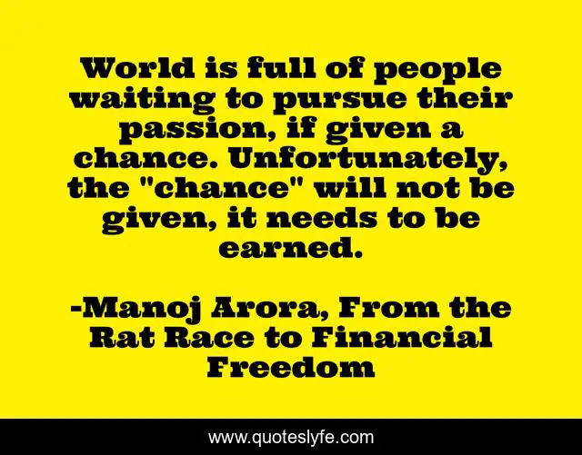 This page presents the quote "World is full of people waiting to pursue their passion, if given a chance. Unfortunately, the "chance" will not be given, it needs to be earned.". Author of this quote is Manoj Arora, From the Rat Race to Financial Freedom. This quote is about earn, passion, goals, dreams,.